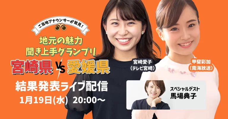 1月19日(水)は、 元日本テレビアナウンサーの馬場典子さんを迎え、結果発表のライブ配信を行います。取材したテレビ宮崎 宮崎愛子アナウンサー・南海放送 甲斐彩加アナウンサーも出演します。馬場典子さんが2人の局アナと一緒に「ご当地アナウンサーが発見! 地元の魅力聞き上手グランプリ」のインタビューVTRを視聴しながら振り返り反省点やインタビューのポイントなどについて、ざっくばらんにお話し結果発表を行います。また、本配信でも宮崎アナウンサーと甲斐アナウンサーから選りすぐりの宮崎県と愛媛県のおすすめの観光スポット、食べ物、名産品をご紹介いただき、視聴者によるウェブ投票も開催予定です。